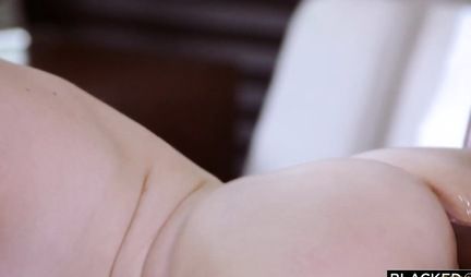 Блондинка на большой кровати получает удовлетворение от секса с накаченным негром