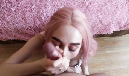 Красивая девушка с розовым цветом волос исполняет для русского красавчика горловой минет