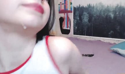 Молодая брюнетка стоя на коленях делает домашний минет и принимает сперму