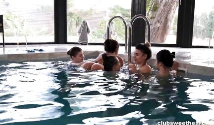 И если кто-то из мужиков на Новый год ходит в баню, то вот эта пятерка симпатичных молодых девушек предпочитает посещать спа-салон на протяжении всего года, наведываясь туда еженедельно по пятницам. И причина столь сильной тяги к купанию в бассейне в том, что девицы ничуть не скромничают, а обязательно в конце помывки начинают ласкать друг друга и гладить во всяких интимных местах, чтобы затем заняться групповым лесбийским сексом. Все верно: лучше заниматься сексом каждую неделю, чем раз в год!