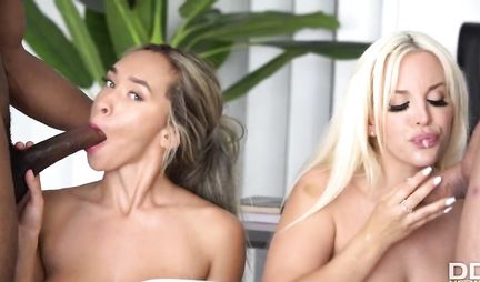 Двумя горячим девчонкам работать в офисе без перерыва банально скучно и неинтересно. Вот потому они не видят ничего зазорно устроить технический перерыв и слегка пошалить друг с другом в плане лесбийского секса и фотосессии. И если после подобных развлечений, они продолжают работать, то зерно желания посеяно и паре коллег с большими членами не составляет ни малейшего труда уломать милашек на межрасовое групповое порно в офисе.